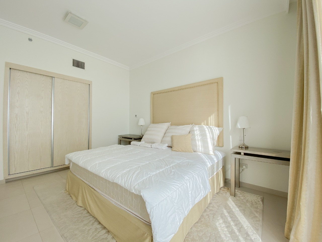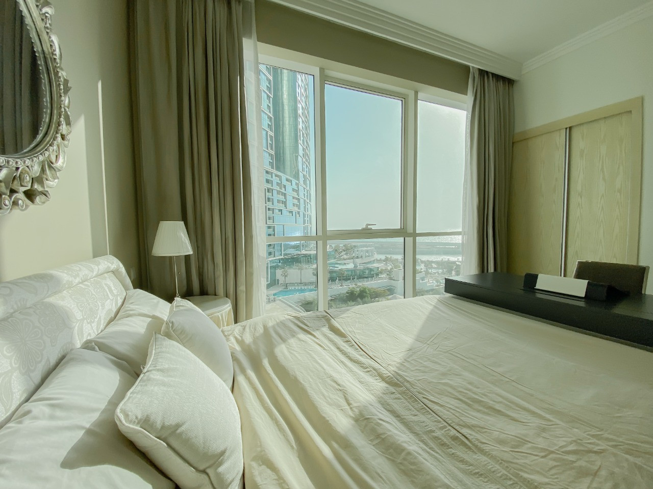 L’appartement comprend 2 chambres avec salles de bains attenantes, un vaste espace de vie, ainsi qu’un grand balcon offrant une vue panoramique sur Palm Jumeirah, Dubai Eye et la mer.